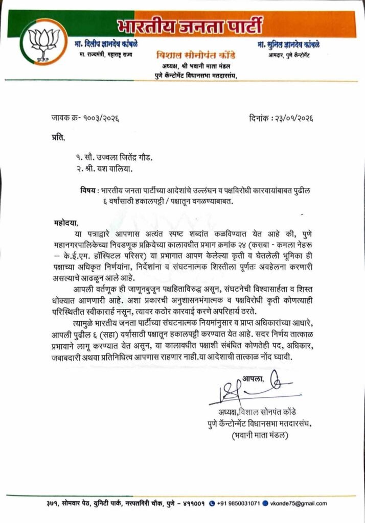 कँटोन्मेंट विधानसभा मतदारसंघाचे मंडल अध्यक्ष विशाल कोंडे यांनी दोन्ही पदाधिकाऱ्यांचे निलंबन व हकालपट्टीचे पत्र अधिकृतपणे प्रसिद्ध केले आहे. या पत्रामध्ये संबंधित पदाधिकाऱ्यांनी पुणे महानगरपालिकेच्या निवडणूक प्रक्रियेच्या कालावधीत घेतलेली भूमिका ही पक्षाच्या अधिकृत निर्णयांना, निर्देशांना व संघटनात्मक शिस्तीला पूर्णतः अवहेलना करणारी असल्याचा ठपका ठेवण्यात आला आहे.